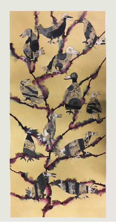 《話臉譜》是由我國傳統戲劇臉譜為基礎,經過線條、色塊的變形,表現出更為夸張的臉部表情。整體色彩鮮明,對比強烈,亮晶晶的粉末裝飾成為點睛之筆,使傳統的京劇臉譜變得更加鮮活、閃亮。