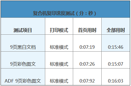 我們也測試了雙面打印速度,換算得到為60.5ppm,有略微的下降,不過仍然是很快的速度。柯尼卡美能達C658復印性能1頁到9頁換算得到為63.9ppm,也與標稱值65ppm的復印速度接近。用ADF復印9頁彩色圖文,換算得到速度為59.4ppm,僅有略微下降,仍然是很出色的性能。