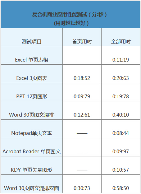 來看柯尼卡美能達復印機bizhubC658的輸出性能實測結果。單頁文件打印用時10秒左右,這還包括文件經過印后處理組件的時間,非常快。而多頁Word、Excel和PPT文件打印速度換算得到為64.7ppm、62.5ppm和66.1ppm在標稱值65ppm附近非常接近,有很高的打印性能。